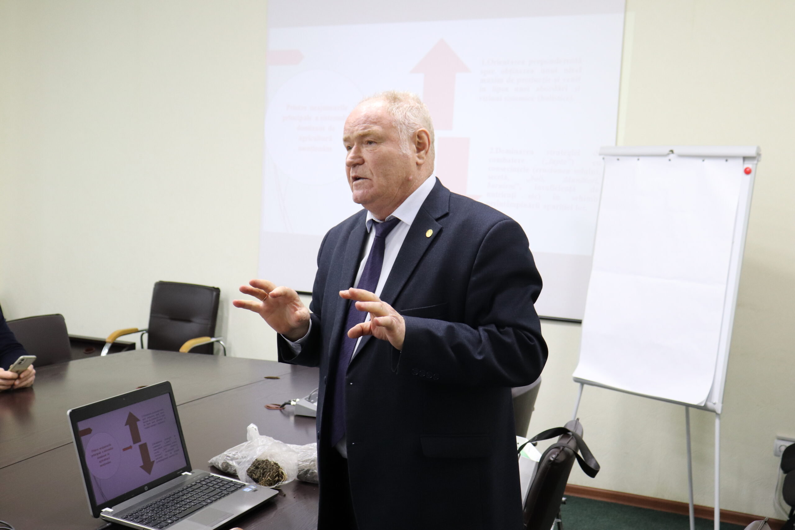Unul dintre specialiști invitați a fost dl. Boris Boincean, doctor habilitat, profesor, cercetător la Institutul de Cercetare pentru Culturile de Câmp „Selecția” și promotor al științei agrare durabile în Republica Moldova. Acesta a vorbit despre particularitățile agrotehnice specifice anului 2025 și despre sporirea competitivității producătorilor agricoli în contextul încălzirii globale. Dl. Boincean a atras atenția asupra secetelor frecvente, în special cele de primăvară, care pot cauza pierderi de până la 30-40% din volumul roadei. De asemenea, el a subliniat importanța respectării unui asolament echilibrat și a hrănirii corecte a plantelor, evitând astfel cheltuieli inutile și eficientizând utilizarea îngrășămintelor.