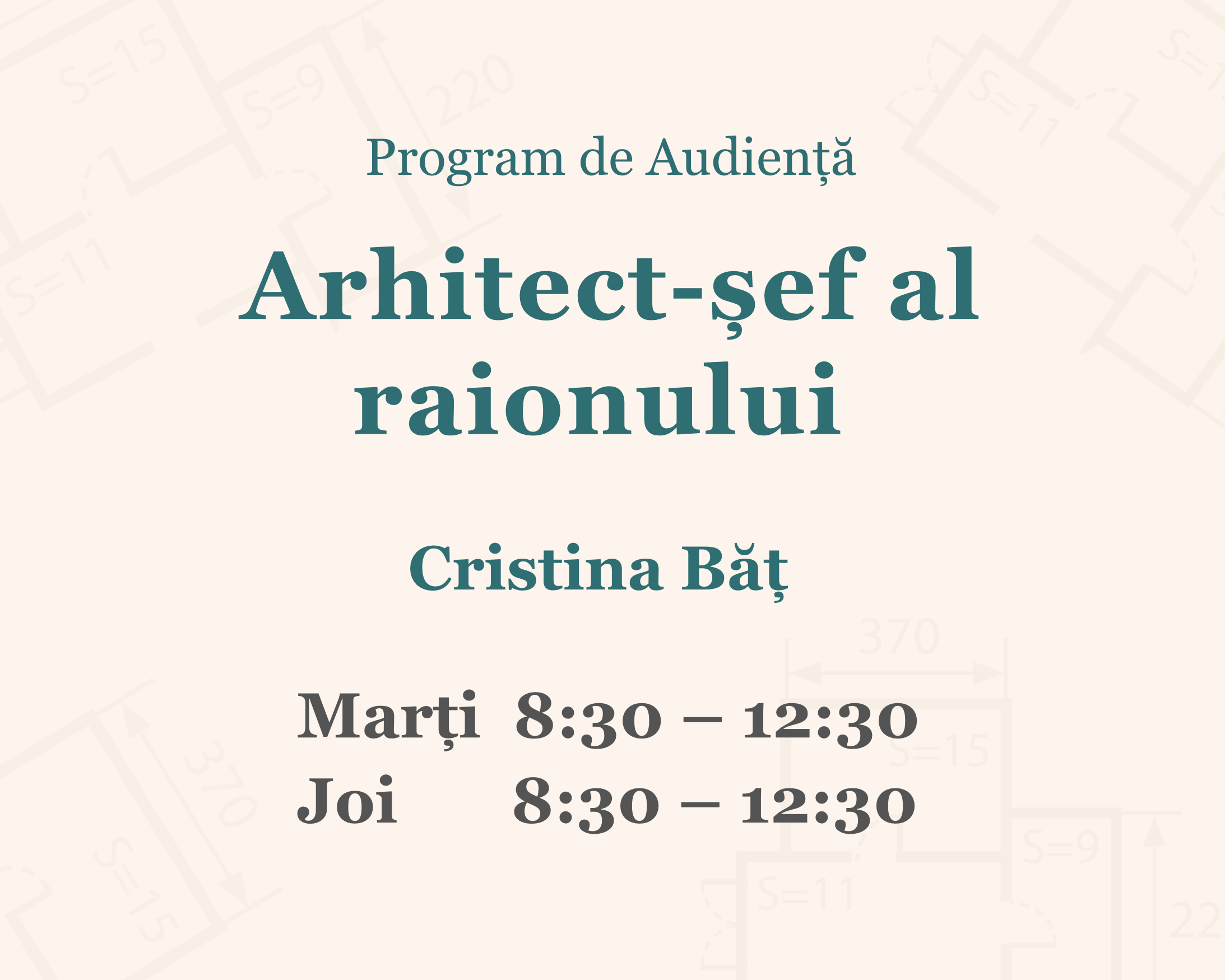 Arhitectul-șef al raionului, Cristina Băț, va desfășura audiențe conform următorului program: