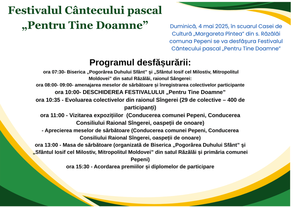 Duminică, 4 mai 2025, în scuarul Casei de Cultură „Margareta Pîntea” din s. Răzălăi comuna Pepeni se va desfășura Festivalul Cântecului pascal „Pentru Tine Doamne”.