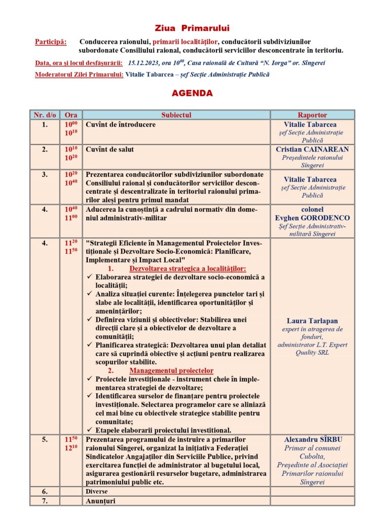 Având drept scop o colaborare și conlucrare pe viitor între Autoritățile administrației publice locale de nivelul II și Autoritățile administrației publice locale de nivelul I, Consiliul raional Sîngerei organizează așa-numita Zi a Primarului, în cadrul căreia vor fi abordate diverse probleme cu care se confruntă în exercitarea atribuțiilor APL I.