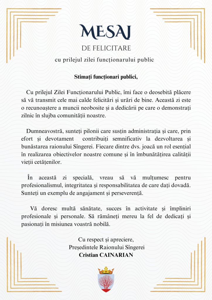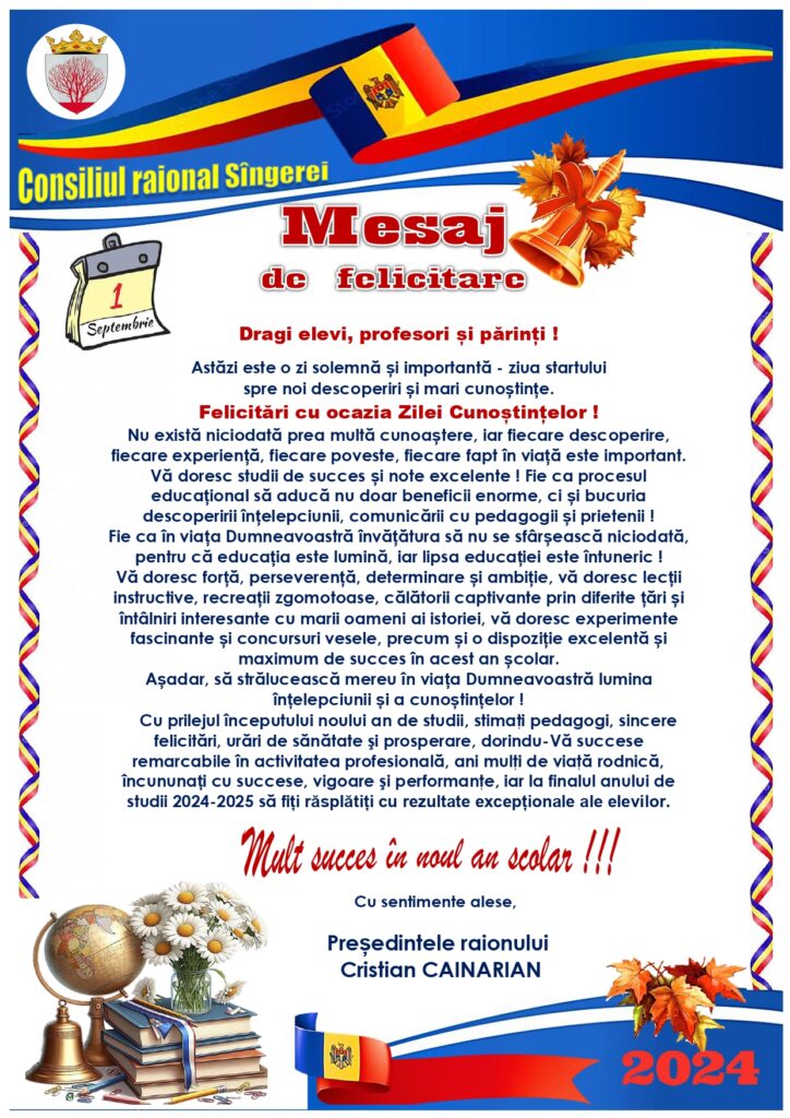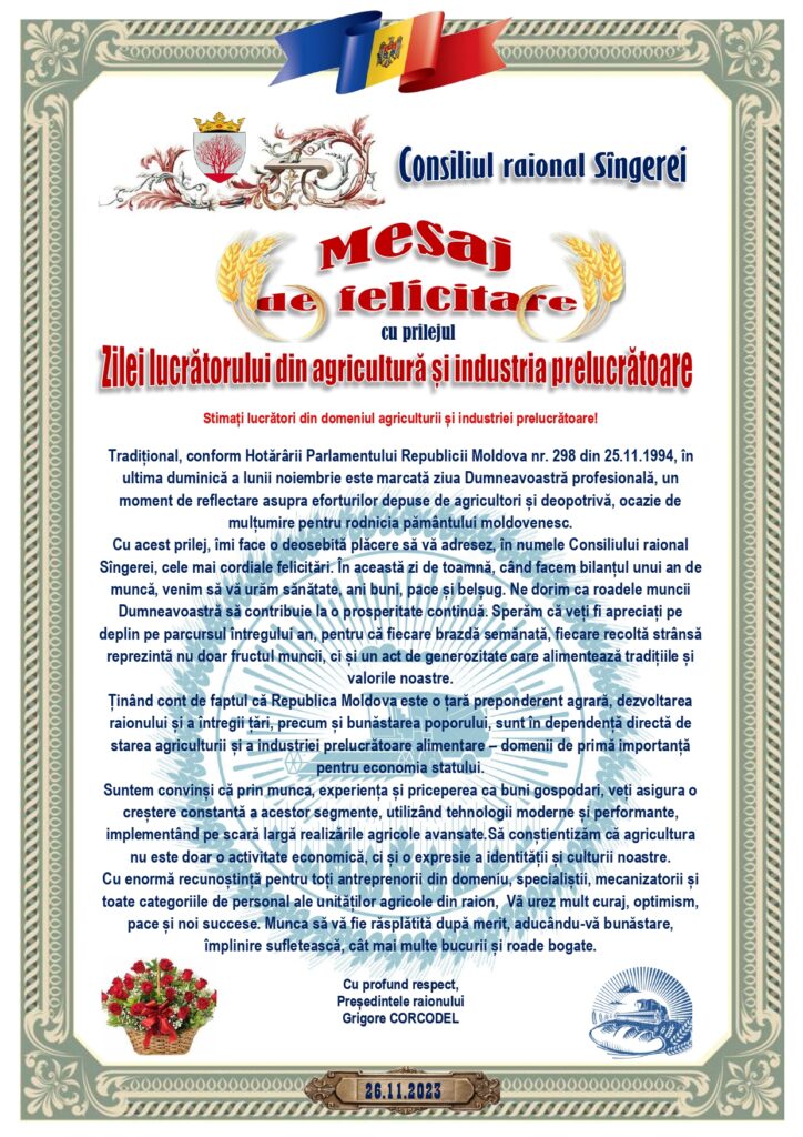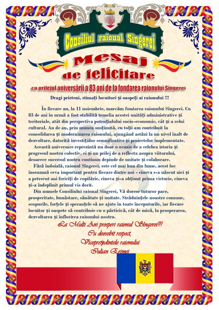 Cu ocazia zilei deosebite a aniversării Dumneavoastră, vă adresăm sincere felicitări și urări de bine. Fie ca această zi să vă aducă nu doar bucurii, ci și recunoaștere pentru contribuția deosebită pe care o aduceți comunității noastre prin implicarea dumneavoastră în activitatea consiliului raional.