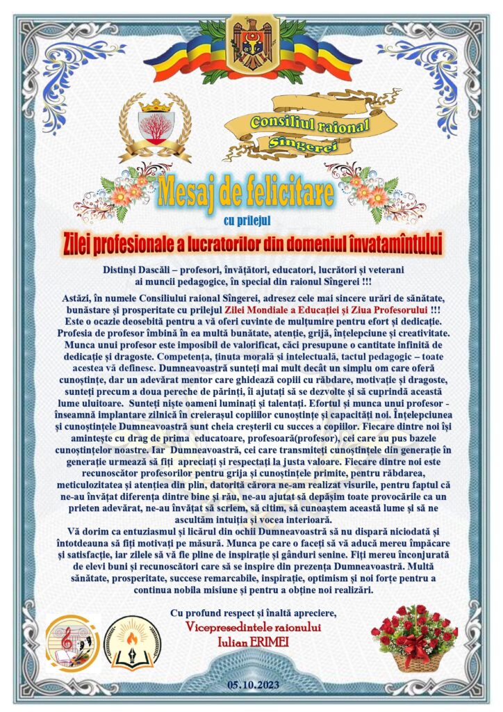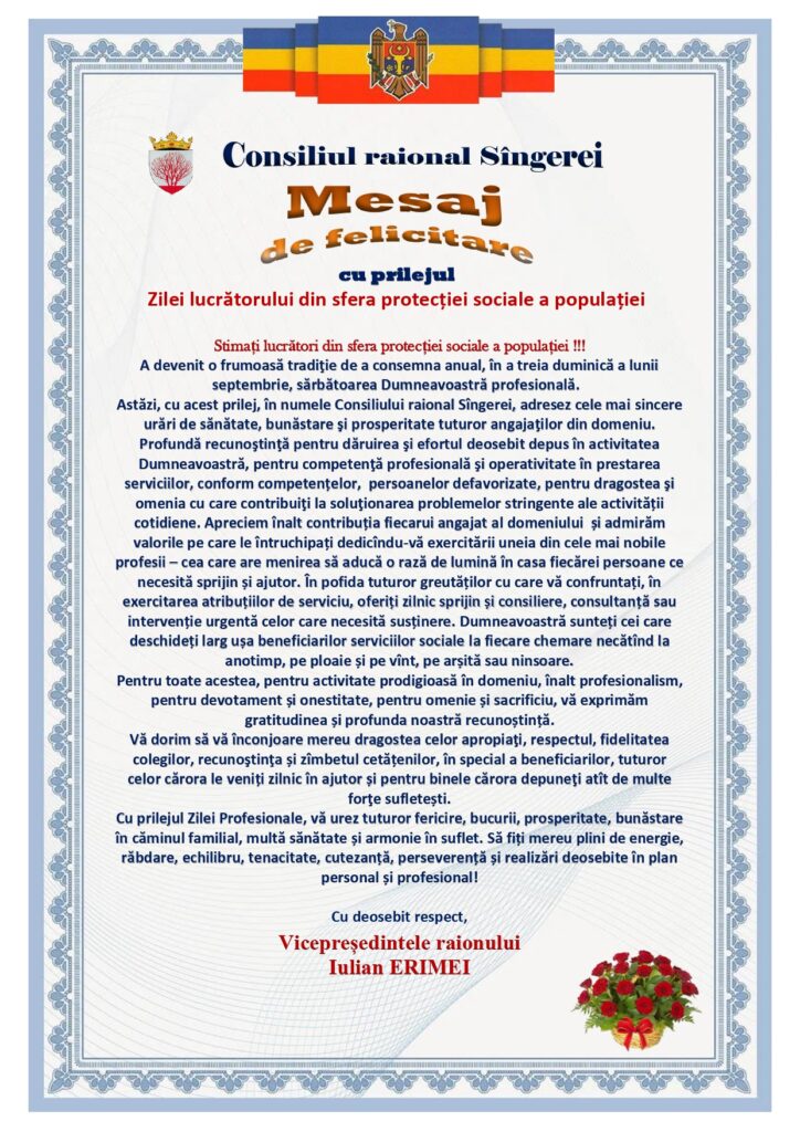În numele întregului Consiliu Raional și în numele personal, Vă dorim să experimentați satisfacția împlinirilor, să aveți putere și rezistență în toate activitățile pe care le desfășurați, să vă bucurați de succesul visurilor voastre îndeplinite și să simțiți dragostea familiei și respectul colegilor.
